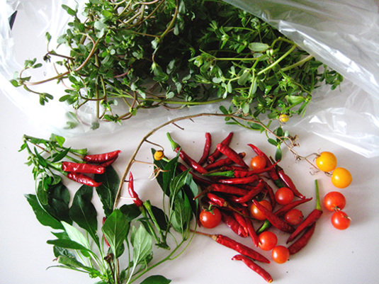 天空は、唐辛子、ミニトマト、スベリヒユ、穫れました。