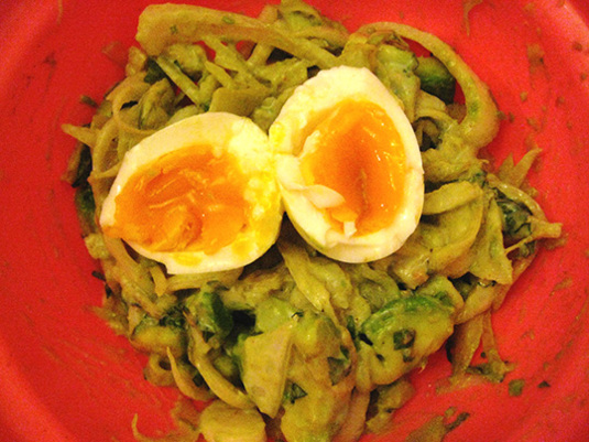 ズッキーニのぬか漬けを縦にスライスして、モロヘイヤはサッと茹で適当に切り、