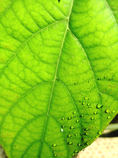葉っぱツヤツヤ元気な葉脈。水はじいて気持ちよさそうだ。