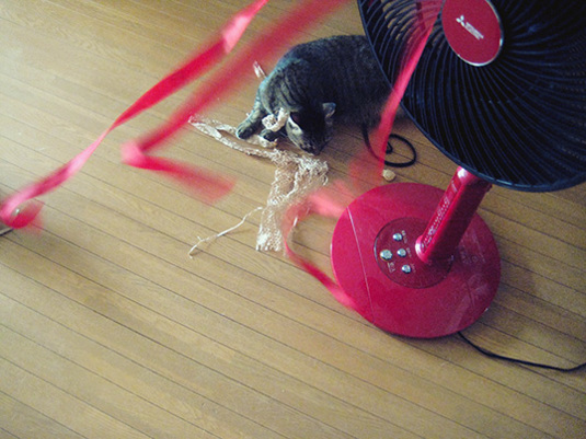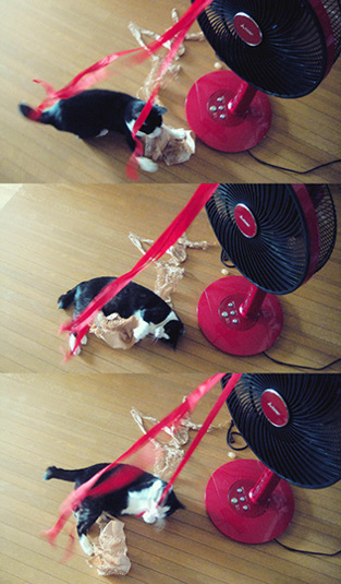 あ、なんかぽつんと落ちている紐状のモノは、どこかの紙袋の取っての部分です。猫用おもちゃ。
