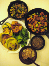 ひと皿は、上記鶏焼きと、つけあわせズッキーニ白・緑、小松菜。