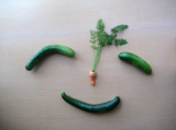 1フライパンは、人参、ちびすけ(キュウリ)、同じくらいに切って炒め、上記鶏焼きもインして、