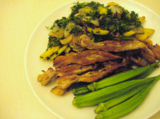 ホーム玉ねぎ、ズッキーニ、スイートキャロットの葉。オリーブオイルで。ニンニクで。焼き。