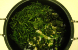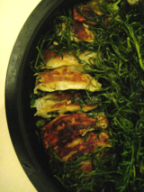 たくさんの葉で、餃子を蒸し焼き状態に。さらに蓋で蒸し。