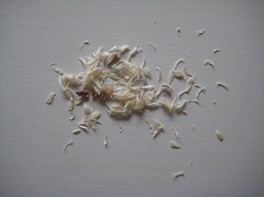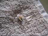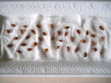 分厚い殻をむいて、中の種を、湿らせたキッチンペーパーの上に、適当均等に。