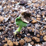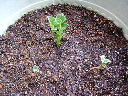 そして、バターナッツカボチャの芽も、種をかぶったまま、うんしょうんしょと生長中。