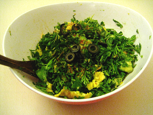 アボカドと、焼き目が少し付いた炒り卵(砂糖入り)と、パクチーと、