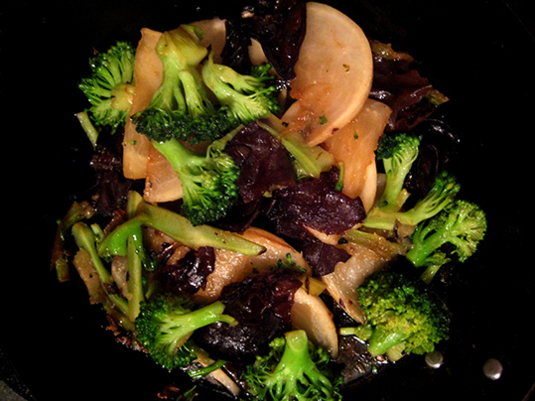 蕪、ブロ、きくらげ、全部を軽く炒めるさ。あまり火を入れなくても美味しいさ。