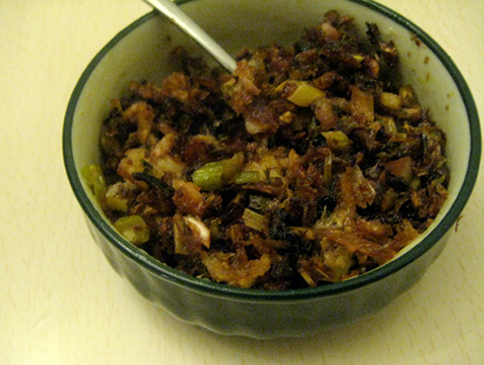 細かく刻んで加えて、水分がある程度無くなるまでさらに煮込み、フォーク等で潰す。