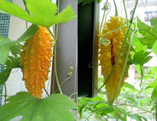 ゴーヤ、裏側から見ると、表面が割れてきていて、種の部分の赤くなったトコロが、