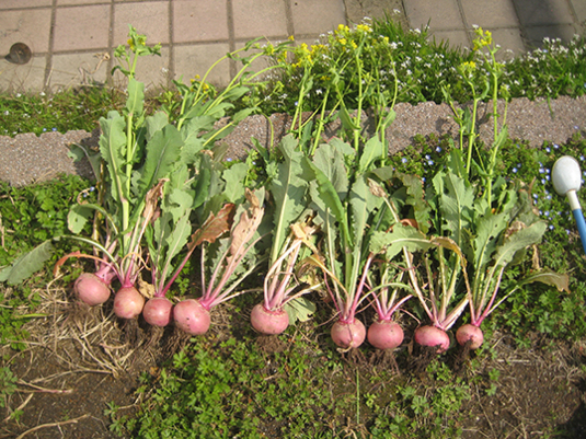 根元に白菜や大根や蕪や小松菜、水菜、チンゲンサイ、等々アブラナ科の美味しいヤツは
