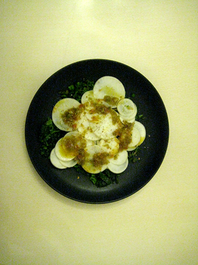 根の部分は生のまま、包丁で適当に薄く輪切りって、スライスして、葉の上に配し、