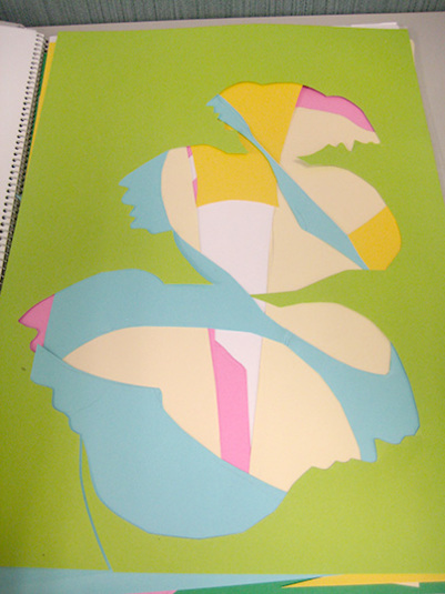 色々切り取ったあとの色画用紙を重ね合わせても、まぁ、面白かったりする。