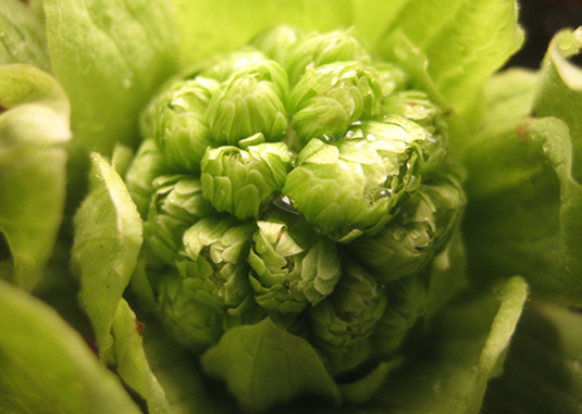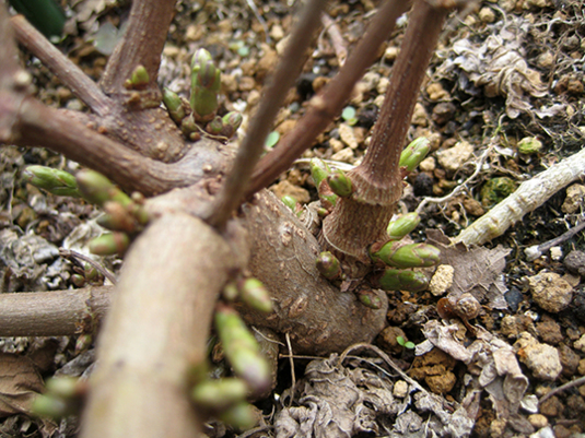 ホップの芽も、春を感じたのか、じょじょに緑色で伸びてきましたねえ。