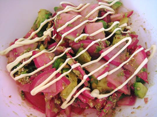 サッと茹で、適当に切り、同じく適当に切ったアボカドと