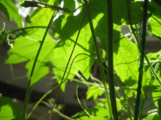 頭にゴーヤの枯れ葉を付けて帰るので、あとあとで気づいて笑えるコト。