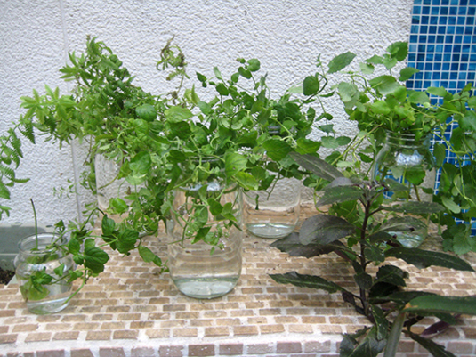 スタジオ前の剪定したハーブたちは、挿し木して増殖計画。