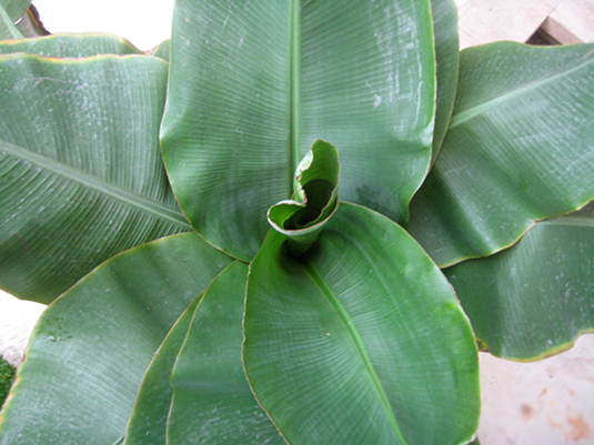 まだ苞の姿が見えない背高モンキーバナナですが、