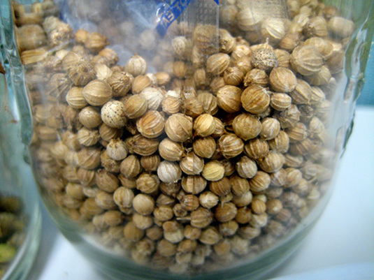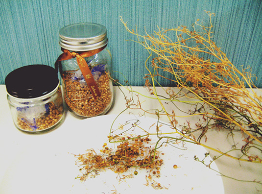 おいおいで枯れてきたパクチーから種を取り、種瓶に、追加で、イン。