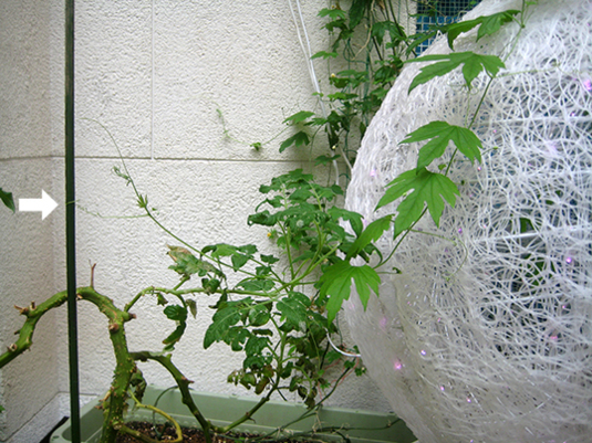 最近は、ミニトマトの支柱にまで、からみ始めましたよ。