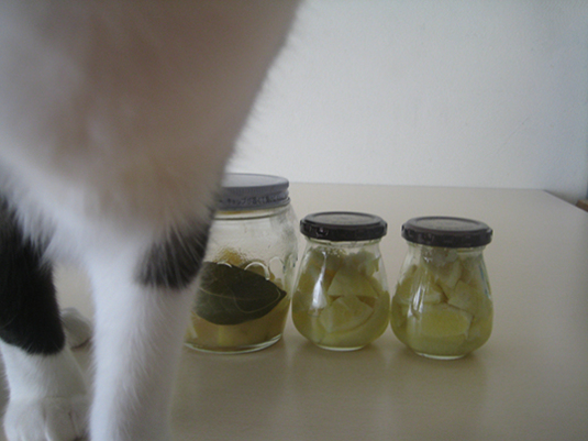 白い蓋が、以前に仕込んだ塩レモン。発酵が進んで、少し?、だいぶ?、色変わってきています。