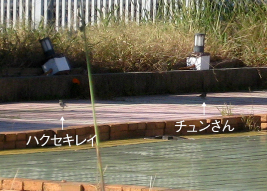 チュンがハクセキレイを追いかけ、ハクセキレイがチュンを追いかけ。