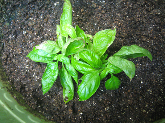 剪定したバジルを水に浸けてしばらく。白い根が生えてきたので、土に移植しました。