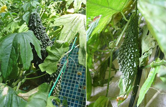 濃い色の実が生っています。>ゴーヤ。