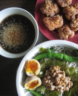 唐揚げ→上記のめんつゆ+ニンニク、ショウガなどの液に漬け込み、
