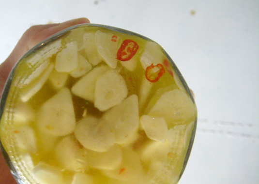 あ、そういえば、先日仕込んだニンニクの酢漬けは、どんな具合かなあ???