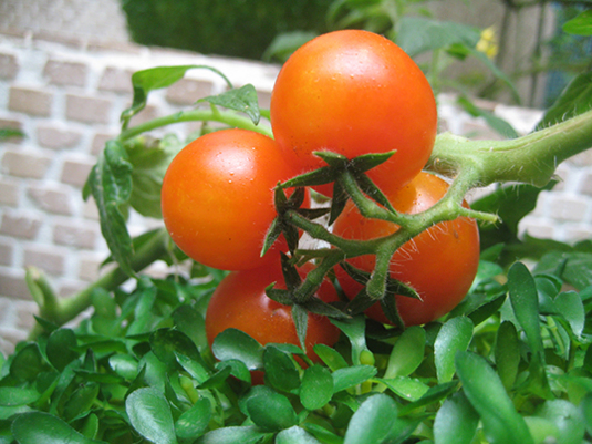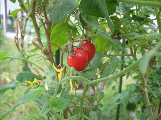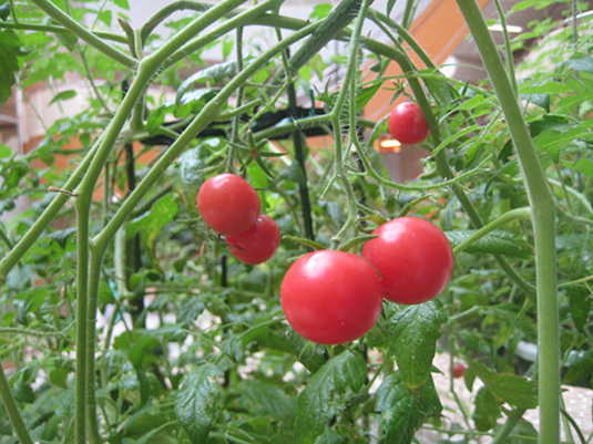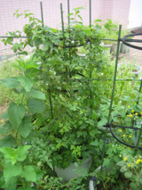ホップ右は、背を高くしつつある、幅を横に広げつつあるミニトマト。