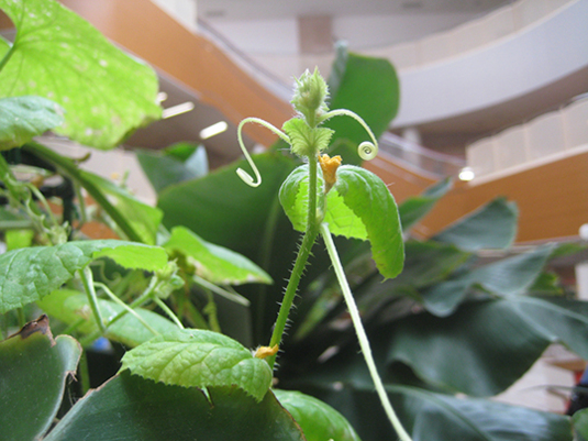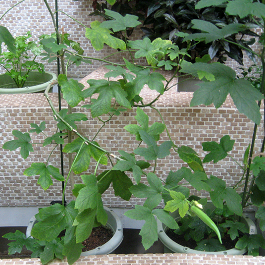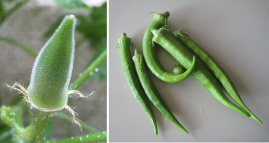 オクラは、実を付けるとビヨ〜ンと垂れ下がり、収穫すると元の高さに戻るという