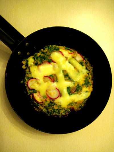 卵1個と全部をまぜまぜ。オリーブオイルでフライパン焼き。