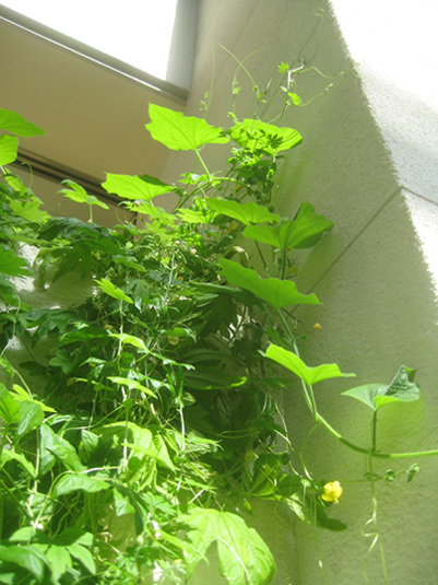 ゴーヤとひょうたんの葉っぱが、入り混じりー。