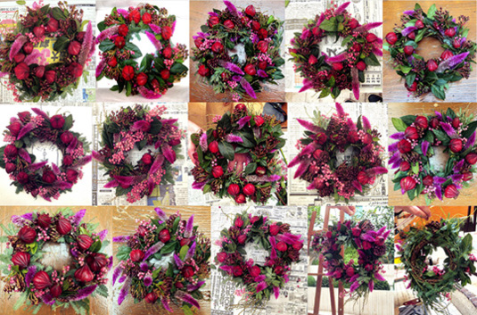 左上から、先生の見本、先生が講座中にササッと作ったリース、CROSS FMの妖精が苦戦中の手w