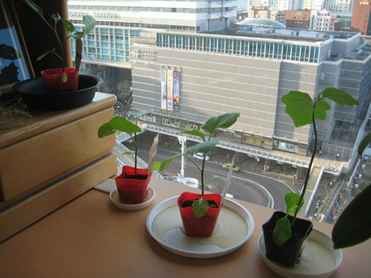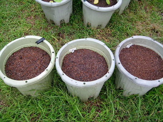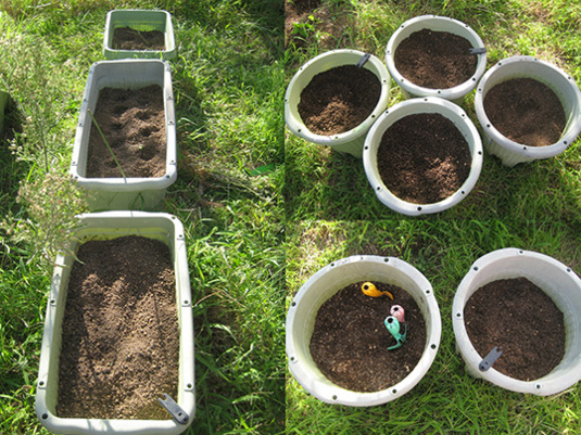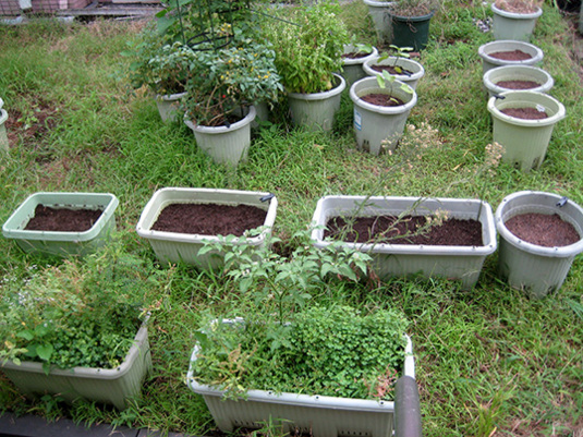 土は、野ざらしにしていたものそのままと、有機石灰を加えたものと、培養土と、