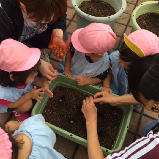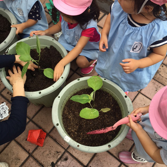 保育園児さんたちと、秋ナスの苗、ホーム玉ねぎの赤ちゃんを植えました。