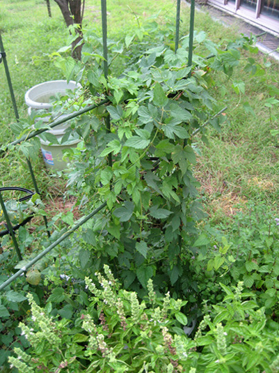 強風対策で、ホップやバジルやミントを、風よけに出来るあたりに設置。