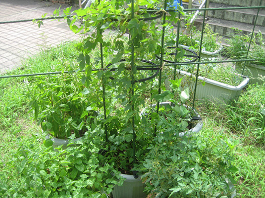 ミニトマト鉢とミニトマト鉢の間には、バジル鉢。