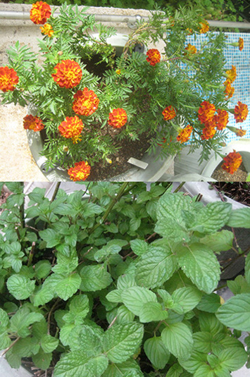 オクラ、トマト、ゼラニウム、ミント、マリーゴールド、レモンバーム、