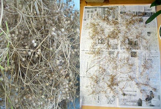新聞紙の上に広げて、種付きのまま、さらに乾燥させます。