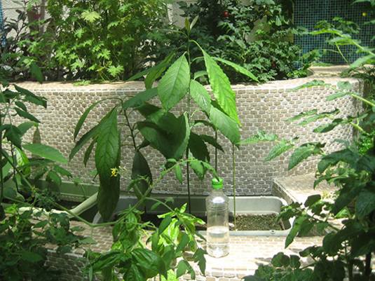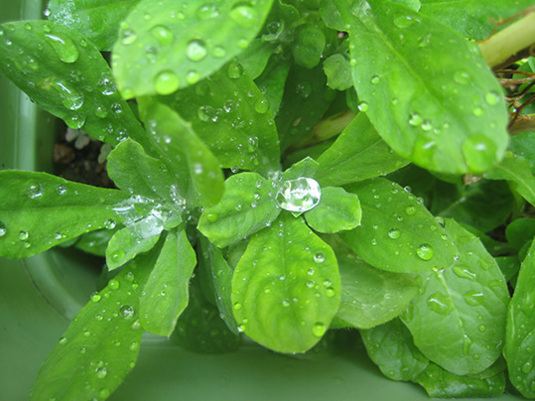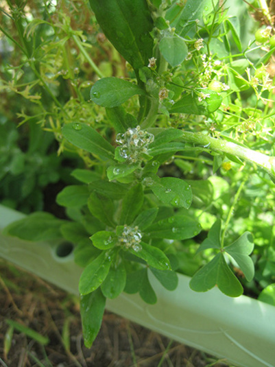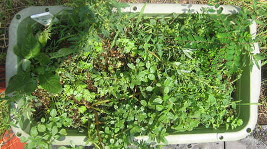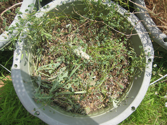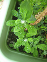 パクチーの鉢は、野草がすっかり牛耳り。でも、ほぼ食べられる野草たちのようなので、