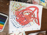 乾いた紙に、色鉛筆や、小道具を使ったりして絵の具でさらに手を加えて、あとは、