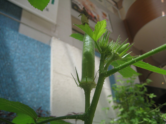 natu-gardenにて、本体葉無し状態から見事再生して復活して実を付けたオクラ!
