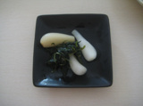 付け合わせは、ゴーヤの葉の酢漬けと、赤村のらっきょ、徳島のらっきょ(白)。