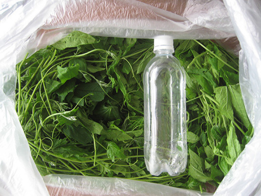 水洗いして、葉は、塩ひとつまみ、砂糖小さじ1もいらない程度で、もみ、しばらく放置。