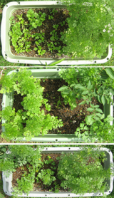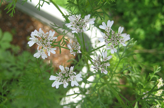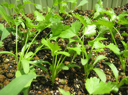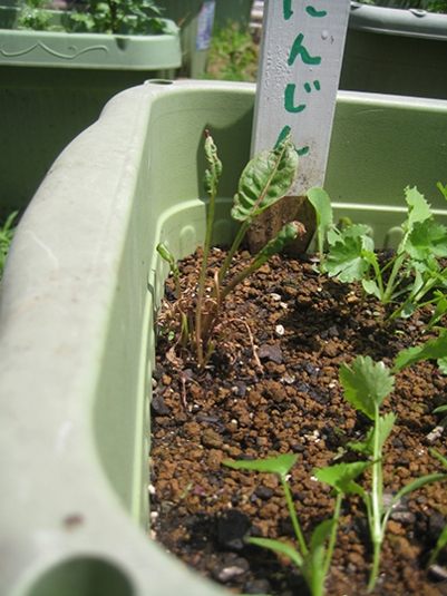 人参のプレートをさしていますが、じつは、パクチーのプランター。