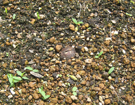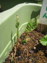 ジャガのプランターを軒下に移したあと、土の中から見え隠れする