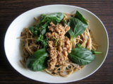 茹でた有機全粒粉パスタ、最初に作った具をインし和え、バジルの残り半量を仕上げの飾り用に。