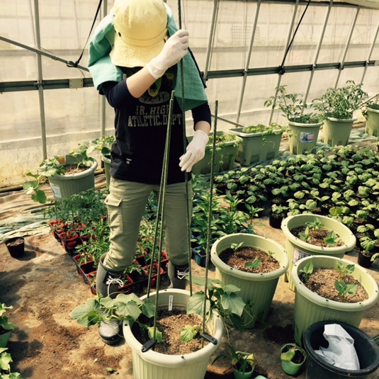 きゅうりとトマトとメロンの伸びた茎をむすびつけていく「誘引作業」を教えてもらいました。